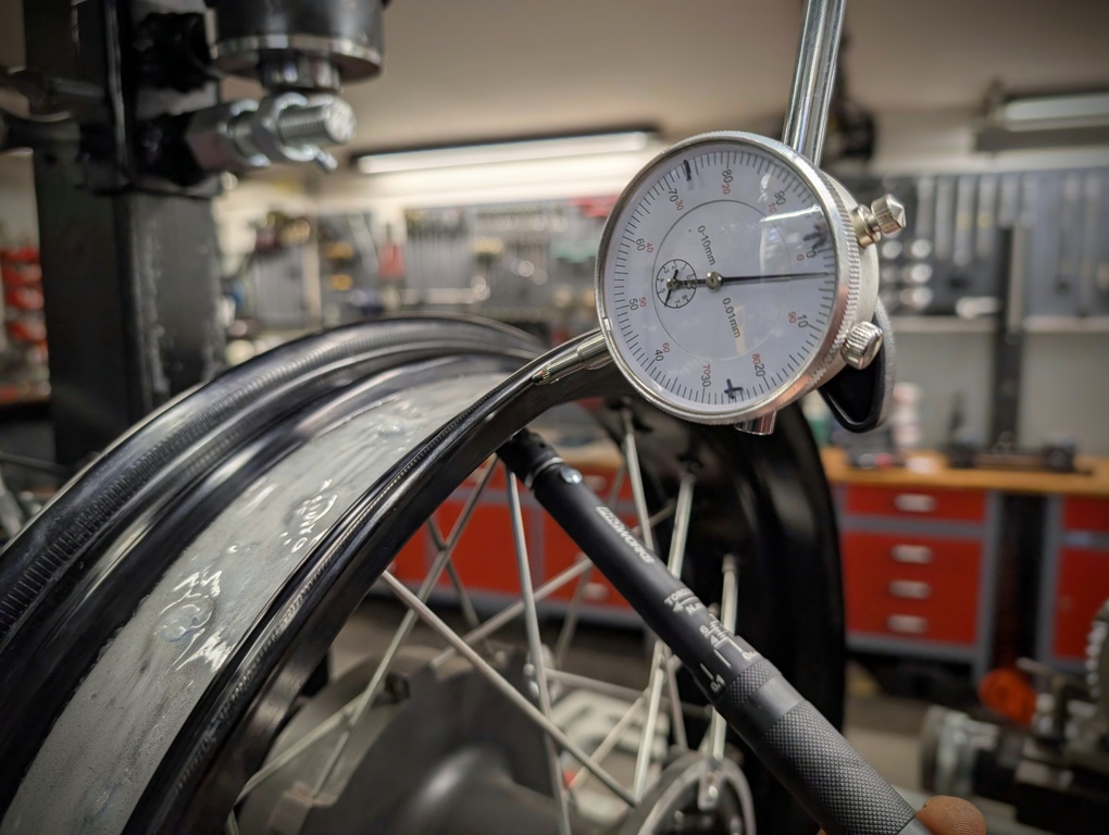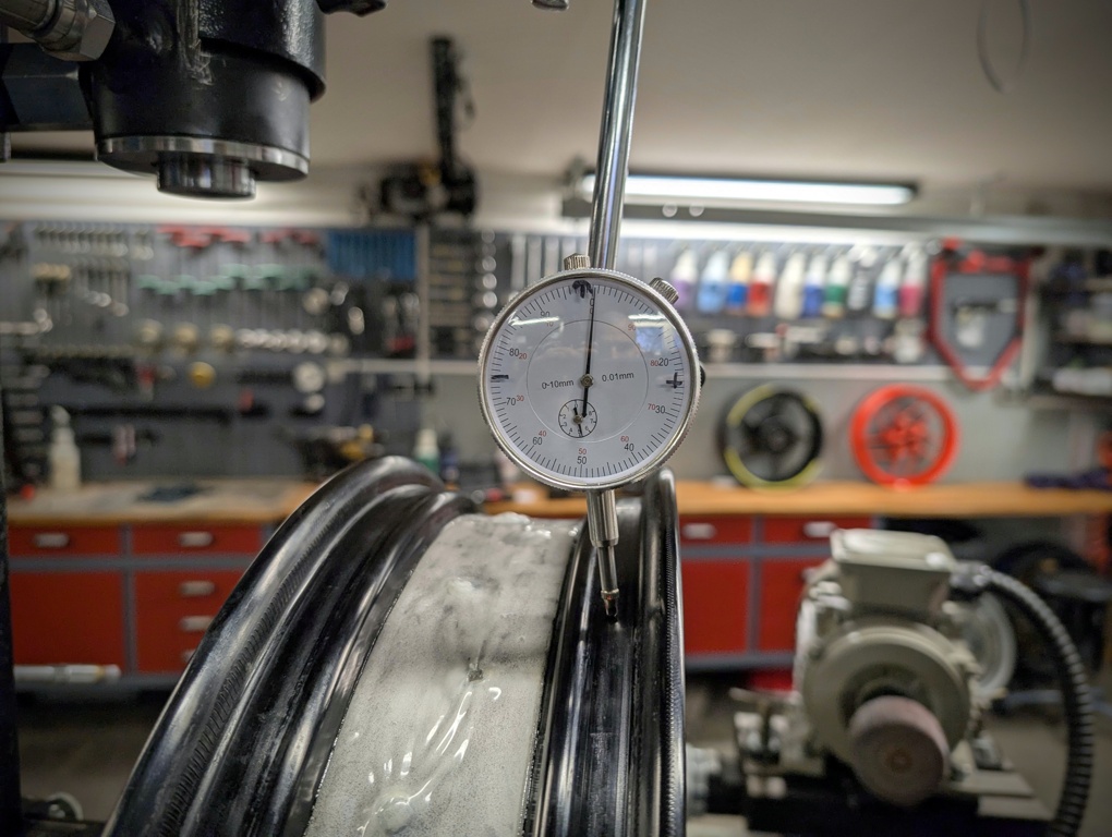 Nakonec stahuji radiální házivost (ovalitu) tak, aby nebyla větší než tolerance při výrobě (u drátěných kol do 1,5 mm)